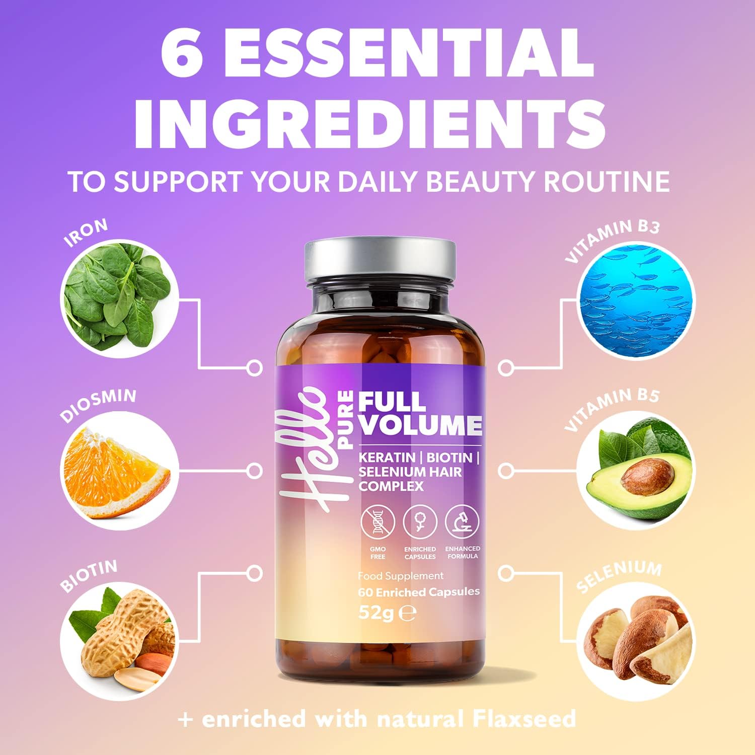 Hello Pure Full Volume Hair Growth Vitamins ‑ Biotin & Keratin Blend ‑ 60 Capsules