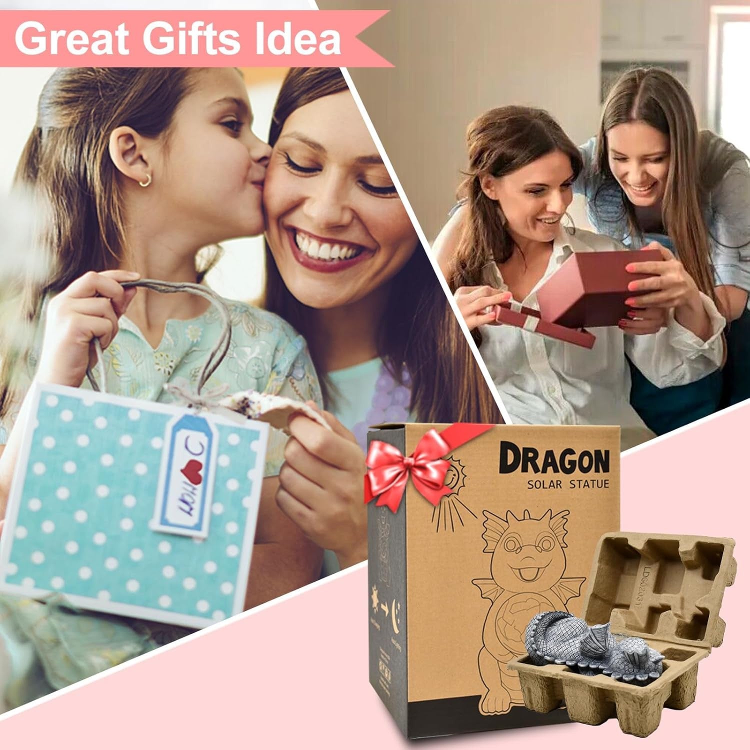 - Whimsical dragon garden statue with a built-in solar light feature.