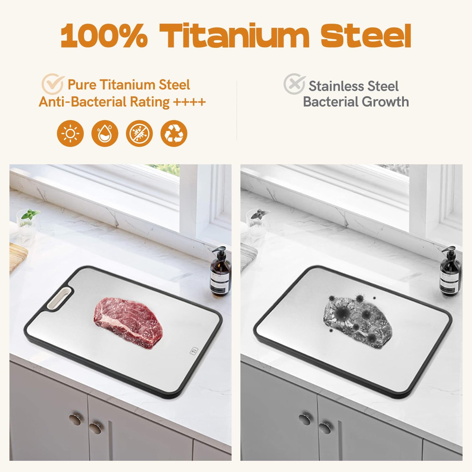 - Double‑sided cutting board with titanium‑coated stainless steel surface