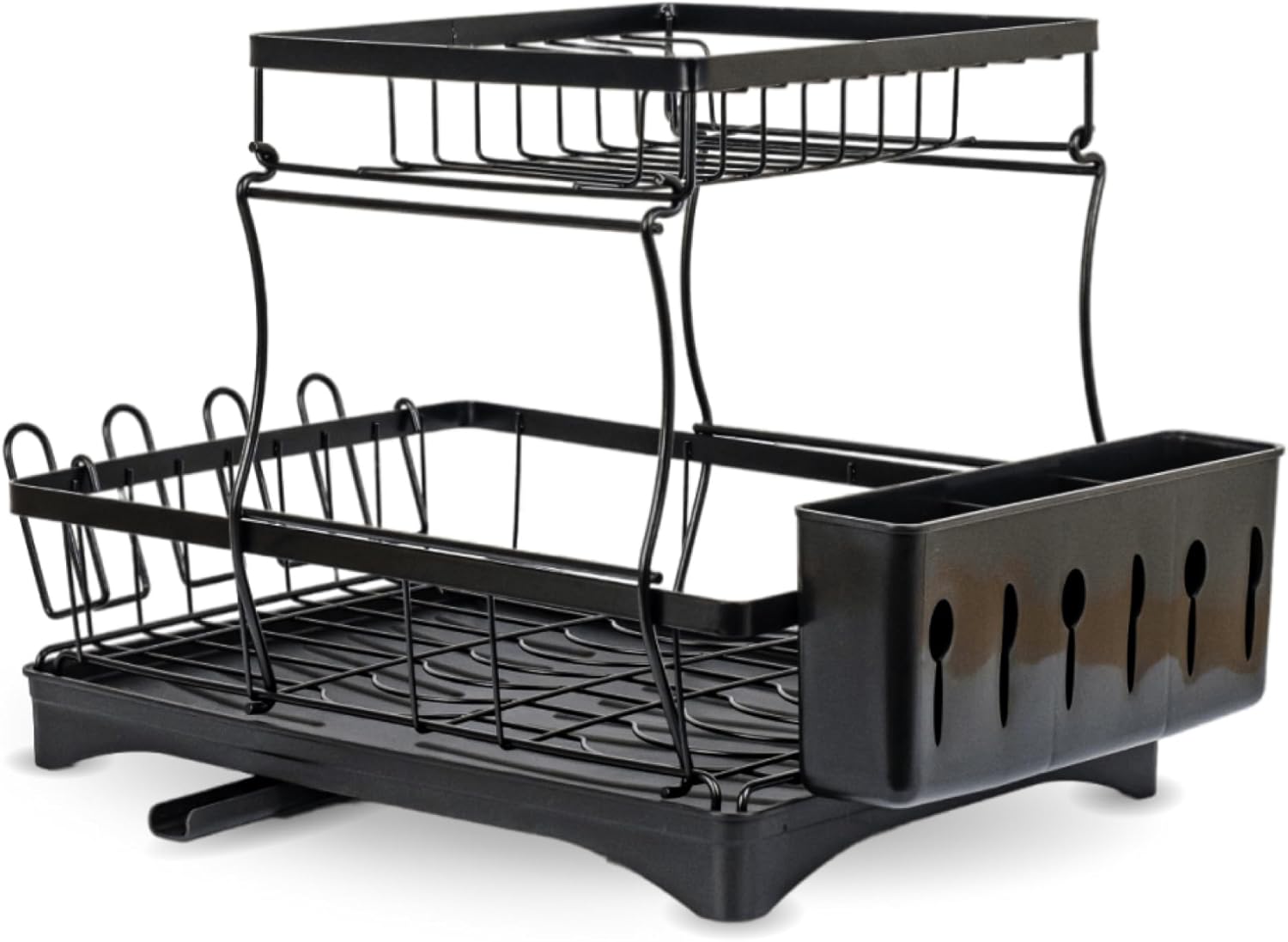 Transform your kitchen counter into a model of efficiency and style with the WOWZILLA 2-Tier Dish Drainer in sophisticated black. Built from high-quality stainless steel with a sleek drip tray, drip basket, and bottle holder, this organizer not only keeps your dishes neat but also elevates your space with its modern, space-saving design.