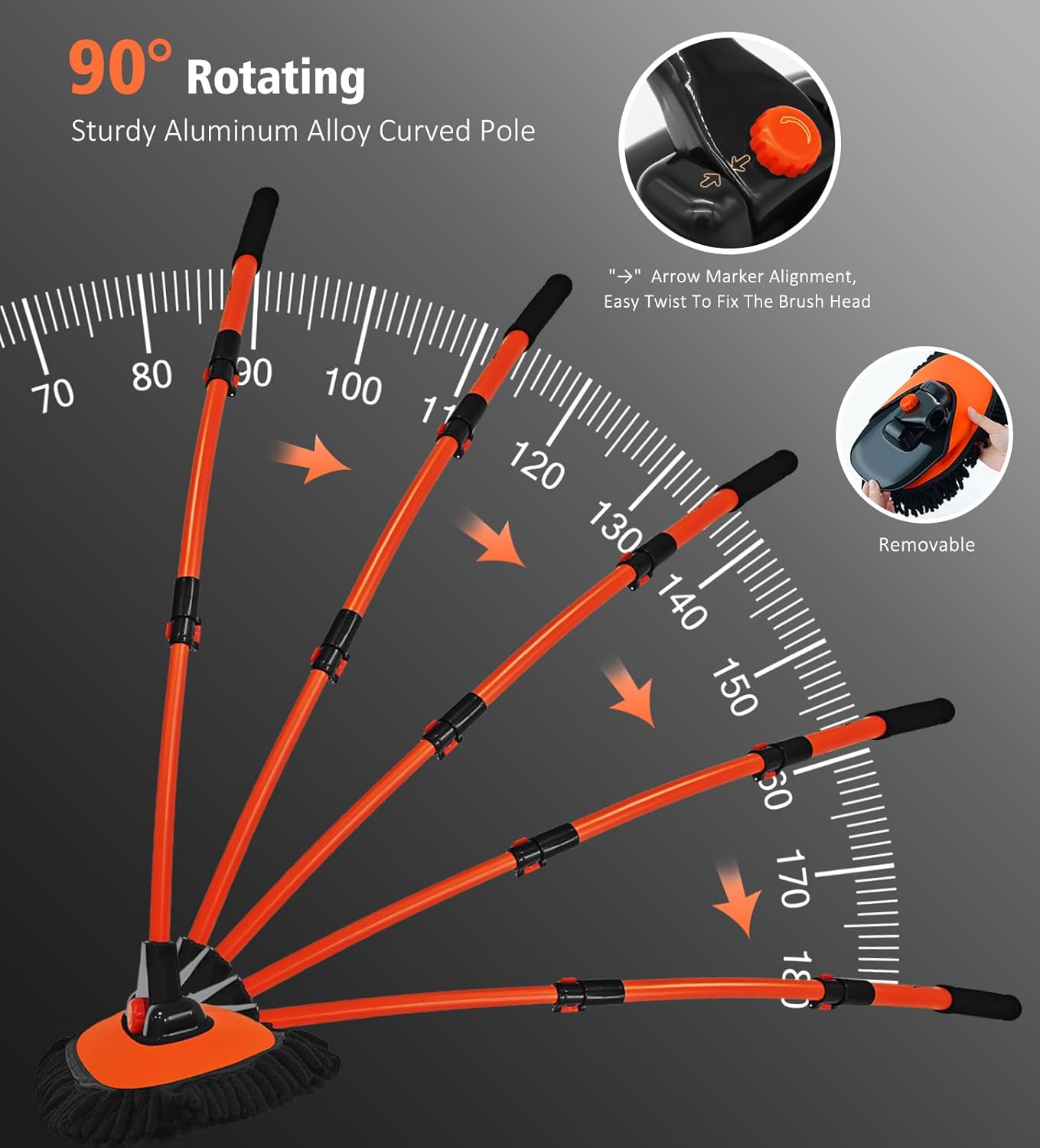 Adjustable & Rotatable Brush Head – Thirty-degree head swivel / 90° adjustable mop head gives flexibility to reach mirrors, window seams, wheel arches, and awkward spots.